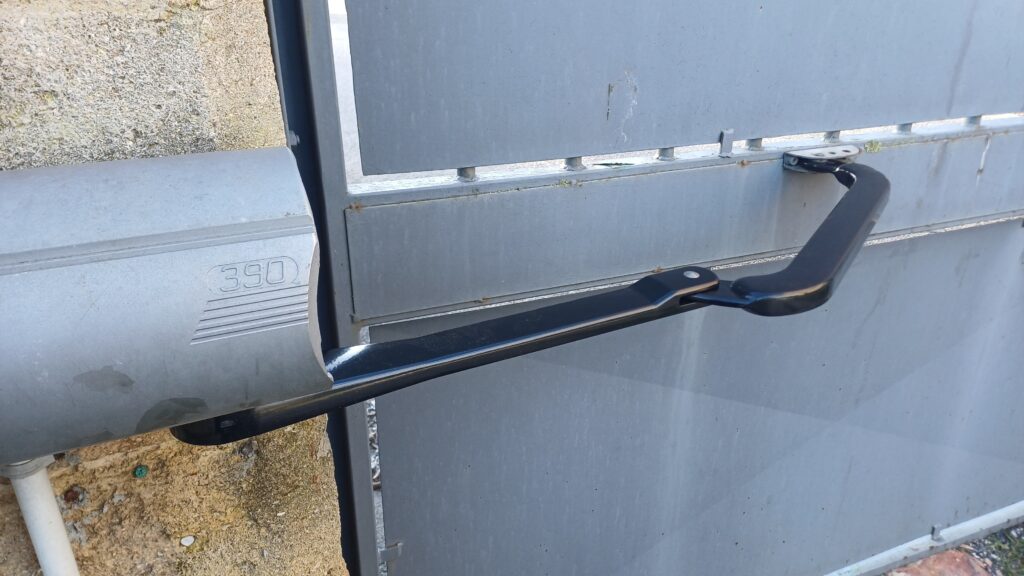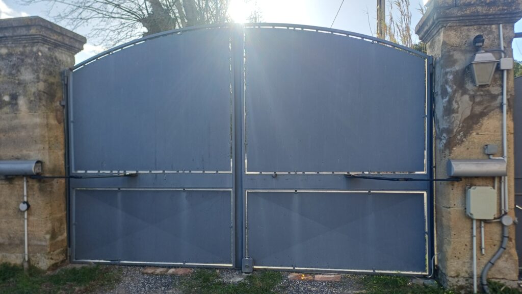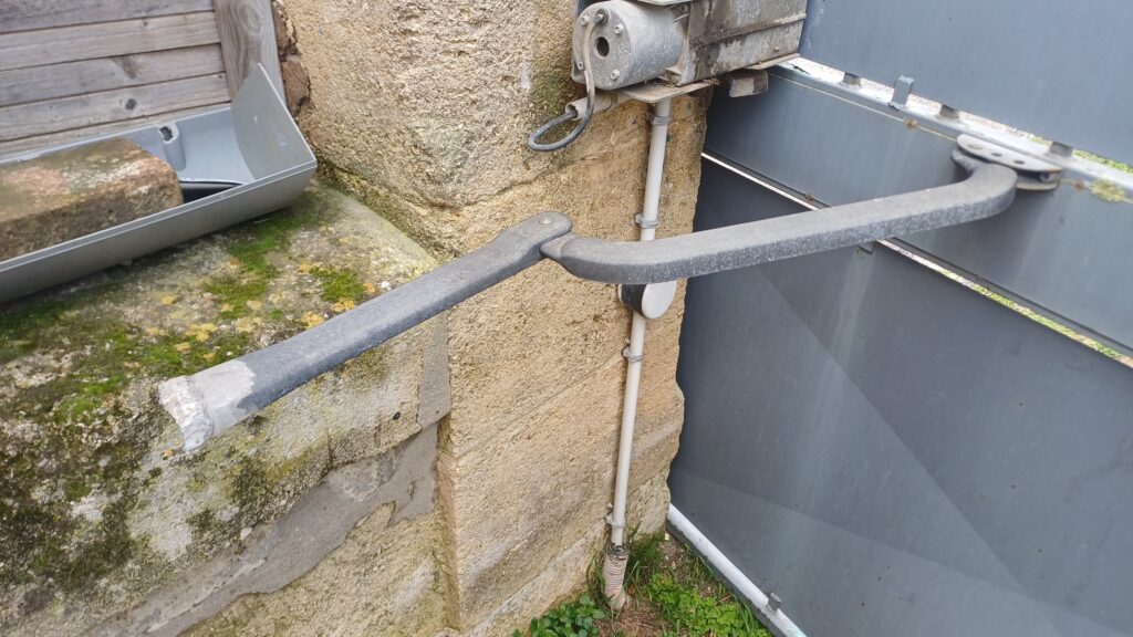 A Narbonne, dépannage d’un portail deux battants. Le bras d’un des moteurs est cassé. Remplacement.
