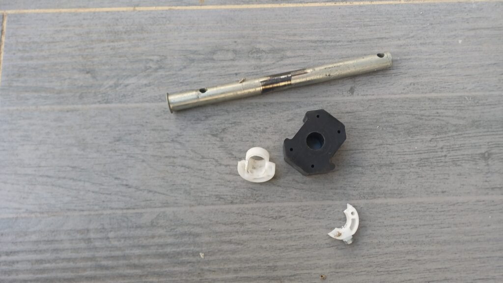 A Salles d’Aude, à côté de Narbonne, dépannage d’un volet roulant en panne. L’embout télescopique en bout de tube est cassé.