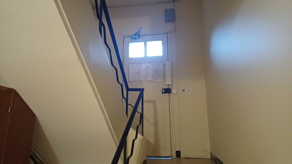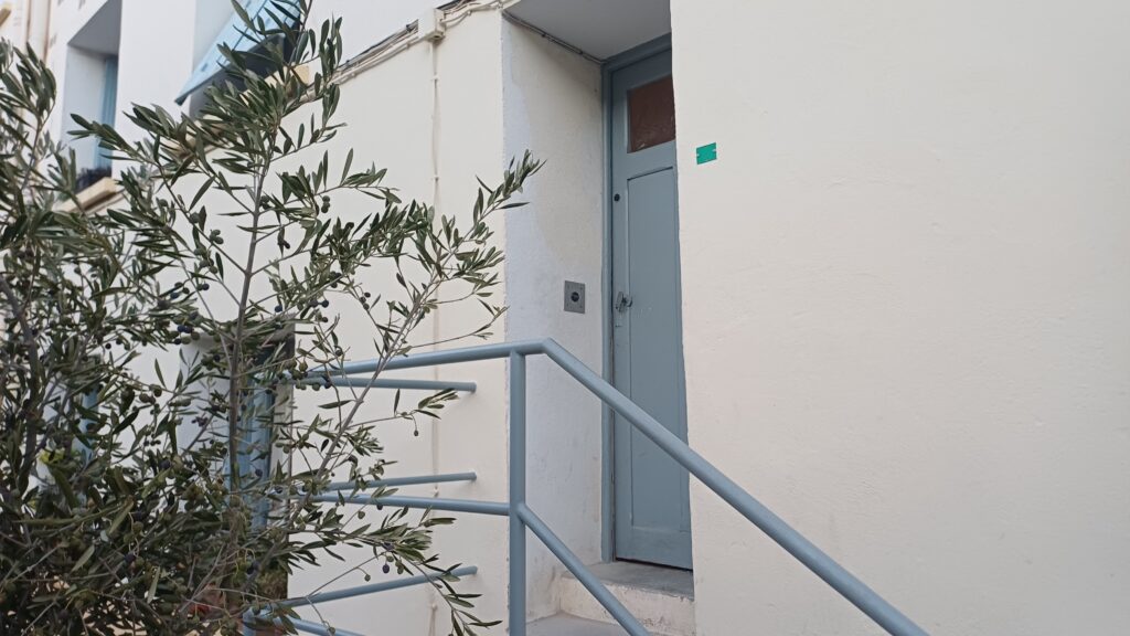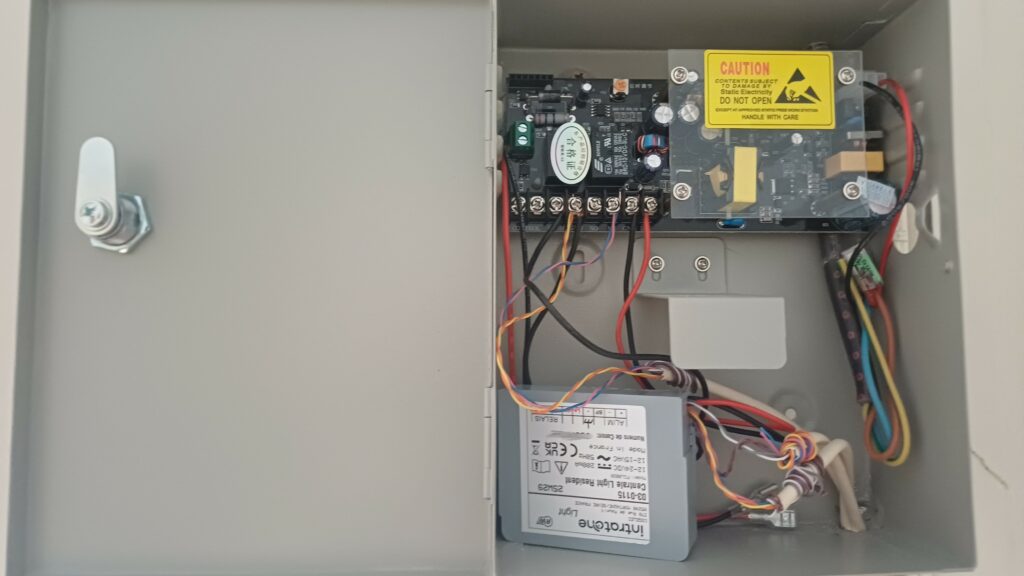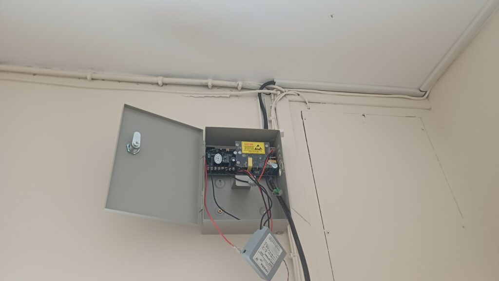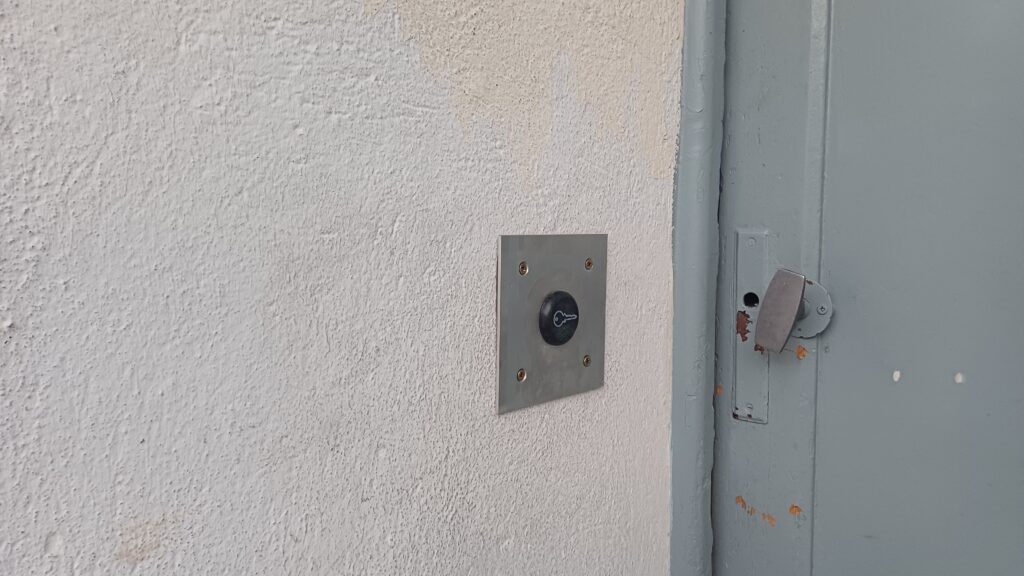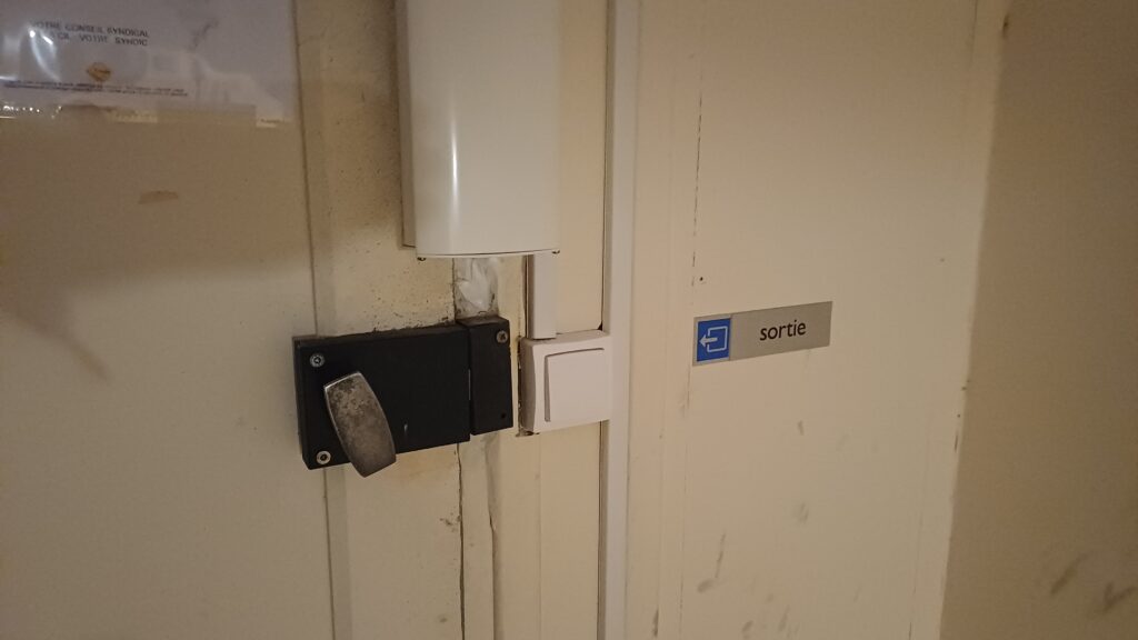 Dans une résidence de Narbonne. Mise en place d’un lecteur de badges Vigik sur une porte de service qui donne sur le parking. Centrale Vigik autonome. Mise en place également d’une poignée ventouse pour la fermeture de la porte.