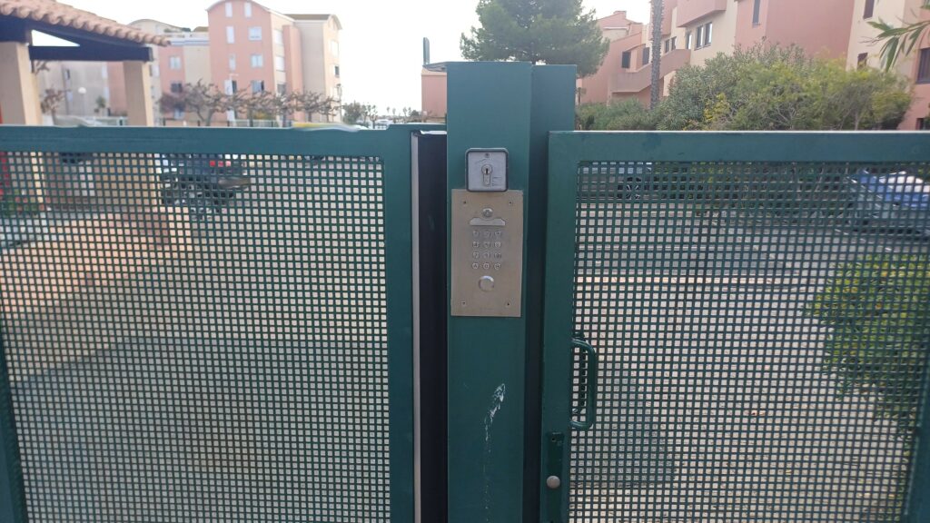 A Gruissan, proche de Narbonne, sur ce portail de copropriété, mise en place d’un pass PTT pour le facteur.